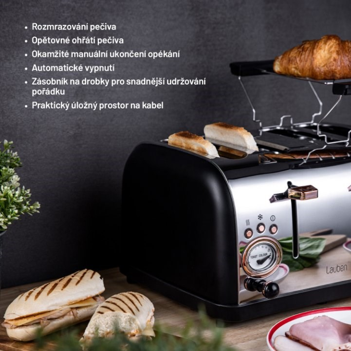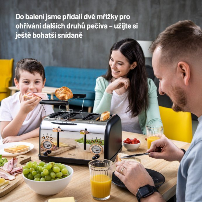 Už žádné hektické snídaně plné hádek o to, kdo si dá první křupavý toast či croissant. Topinkovač Lauben 4 Slice Toaster 1500BC připraví křupavé pečivo pro celou rodinu a vy si tak užijete poklidný start nového dne. Topinkovač opeče najednou toasty ve čtyřech slotech a na dvou ohřívacích mřížkách, jež jsou součástí balení, lze rozpéct třeba croissanty, které tak budou jako čerstvě upečené. Zvolit lze z 6 stupňů intenzity a budete-li potřebovat opékání zastavit, topinkovač disponuje funkcí okamžitého manuálního ukončení.