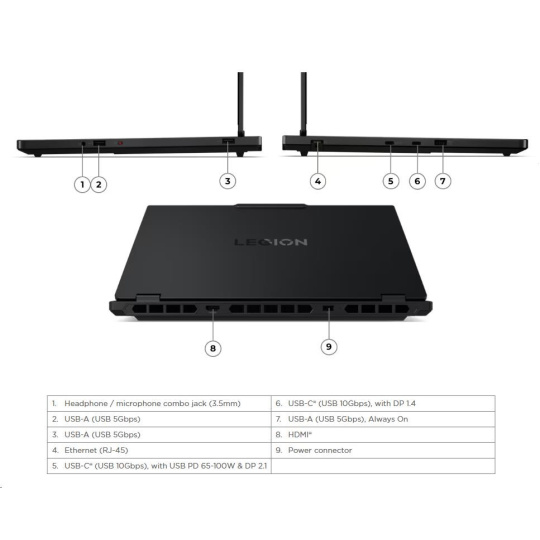 | Standartné porty | 2x USB-A (USB 5Gbps / USB 3.2 Gen 1) 1x USB-A (USB 5Gbps / USB 3.2 Gen 1), Always On 1x USB-C® (USB 10Gbps / USB 3.2 Gen 2), with USB PD 65-100W and DisplayPort™ 2.1 1x USB-C® (USB 10Gbps / USB 3.2 Gen 2), with DisplayPort™ 1.4 1x HDMI® 2.1, up to 8K/60Hz 1x Headphone / microphone combo jack (3.5mm) 1x Ethernet (RJ-45) 1x Power connector |
