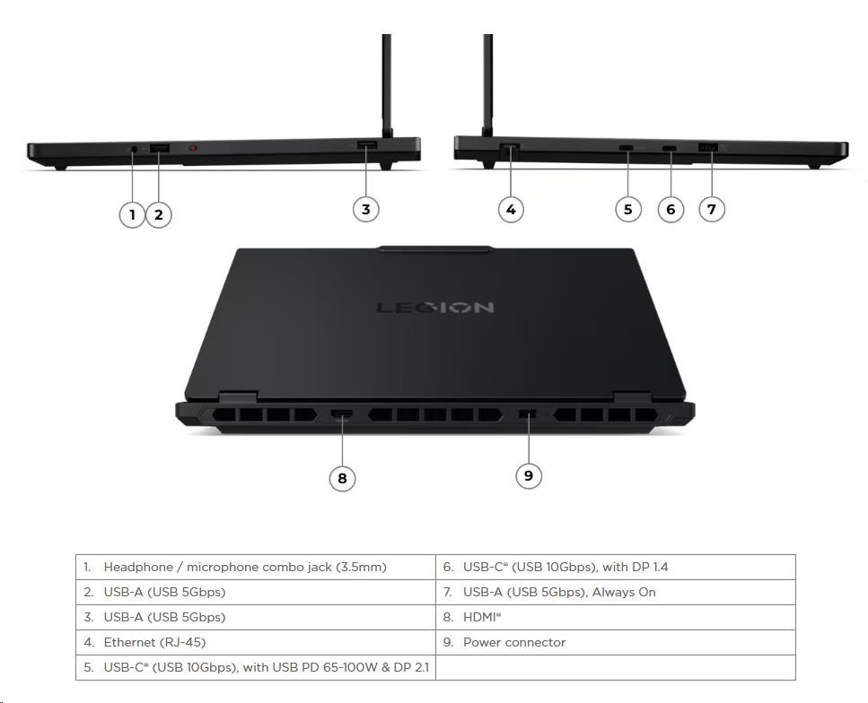 | Standartné porty | 2x USB-A (USB 5Gbps / USB 3.2 Gen 1) 1x USB-A (USB 5Gbps / USB 3.2 Gen 1), Always On 1x USB-C® (USB 10Gbps / USB 3.2 Gen 2), with USB PD 65-100W and DisplayPort™ 2.1 1x USB-C® (USB 10Gbps / USB 3.2 Gen 2), with DisplayPort™ 1.4 1x HDMI® 2.1, up to 8K/60Hz 1x Headphone / microphone combo jack (3.5mm) 1x Ethernet (RJ-45) 1x Power connector |