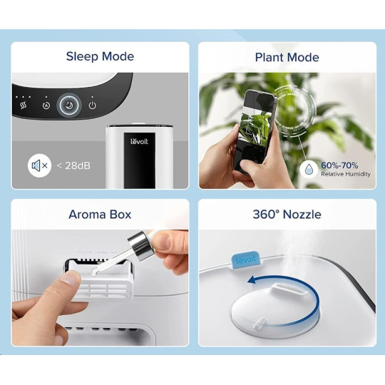 Provoz je velice tichý a nebude vás rušit ani při spaní. Budete moci nerušeně snít a zvlhčovač Levoit OasisMist Smart se postará o kvalitu a vlhkost vzduchu v místnosti podle vašich představ. Hlučnost v provozu je pouhých 28 dB.