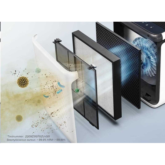 Filtrace vzduchu probíhá ve 3 vrstvách. První je vnější umývatelný předfiltr, který zachycuje nejhrubší částice jako prach, vlákna, části vlasů nebo chlupů.