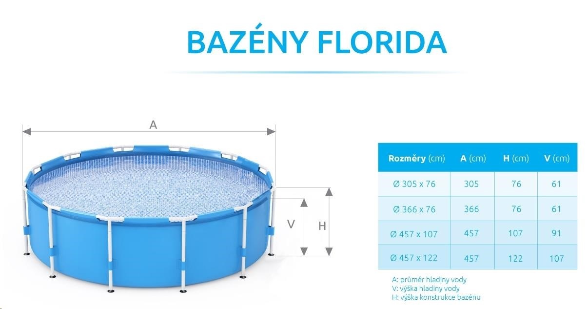 Bazén Marimex Florida se řadí mezi velmi oblíbené nadzemní bazény v České republice. Koupání ve vlastním velkém bazénu si může dopřát opravdu každý. Hlavním benefitem bazénu Florida je výhodná cena, snadná údržba, stabilita konstrukce, široká hladina vody i snadné zprovoznění..... více