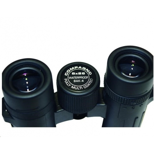 Dalekohled kompaktní COMPAGNO 10x26, zvětšení 10x, přední čočka 26mm, zorné pole 98m, ostré od 4m, optický výstup 2,6mm, vzdálenost středu očí 56-74mm s odstupem 14,1mm, světelnost 6,8, stmívání 16,1, rozměry 117x115x40 mm, hmotnost 325g, černý. Dalekohledy kompaktní DCF se střechovými hranoly BaK4 - ROOF (DACH). Modelová řada s moderním designem, malými rozměry, nízkou hmotností a vysokou optickou kvalitou pro kontrastní pohled i při zhoršených světelných podmínkách. Výkonný a odolný dalekohled s Fully Multicoated úpravou, hranoly z BaK4 skla, voděodolný do 0,5m/15min s ochranou proti zamlžení plněním Dusíkem, vhodné i pro sledování s brýlemi, nastavení +/-4 dioptrie, výsuvné krytky okuláru, stativový závit, pogumováné tělo z ABS. Včetně textilního pouzdra, popruhu a čistícího hadříku. Malý ale maximálně výkonný dalekohled do kapsy pro turistiku..
