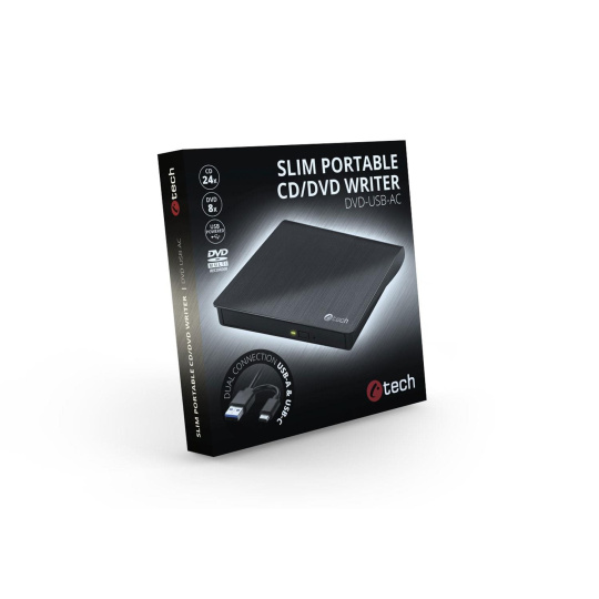 C-tech DVD-USB-AC je elegantní externí DVD vypalovačka, která se vyznačuje kompaktním a snadno přenosným slim provedením s integrovaným USB kabelem. Představuje praktické řešení pro PC a notebooky bez optické mechaniky. Mechanika se k zařízením připojuje prostřednictvím integrovanému kabelu USB-C nebo USB-A standartu USB 2.0. Kabel je integrovaný ve spodní části mechaniky, takže jej budete mít neustále k dispozici. Napájení celého zařízení je pouze přes tento integrovaný USB kabel. Externí DVD vypalovačka umožnuje číst a uložit si data na CD, stejně i na DVD s kapacitou 8,5GB pro dvouvrstvý disk a 4,7GB dat pro jednovrstvý disk. Vypalovat můžete rychlostí až 8× v případě DVD a 24× u CD. Podpora ochrany proti podtečení zásobníku navíc brání případným problémům. DVD vypalovačka podporuje nejen standardní 12cm CD a DVD, ale také jejich 8cm mini varianty. Mechanika podporuje Plug and Play standart, takže ji stačí pouze připojit k zařízení a počkat na automatickou instalaci ovladačů a následně začít mechaniku plně využívat.
