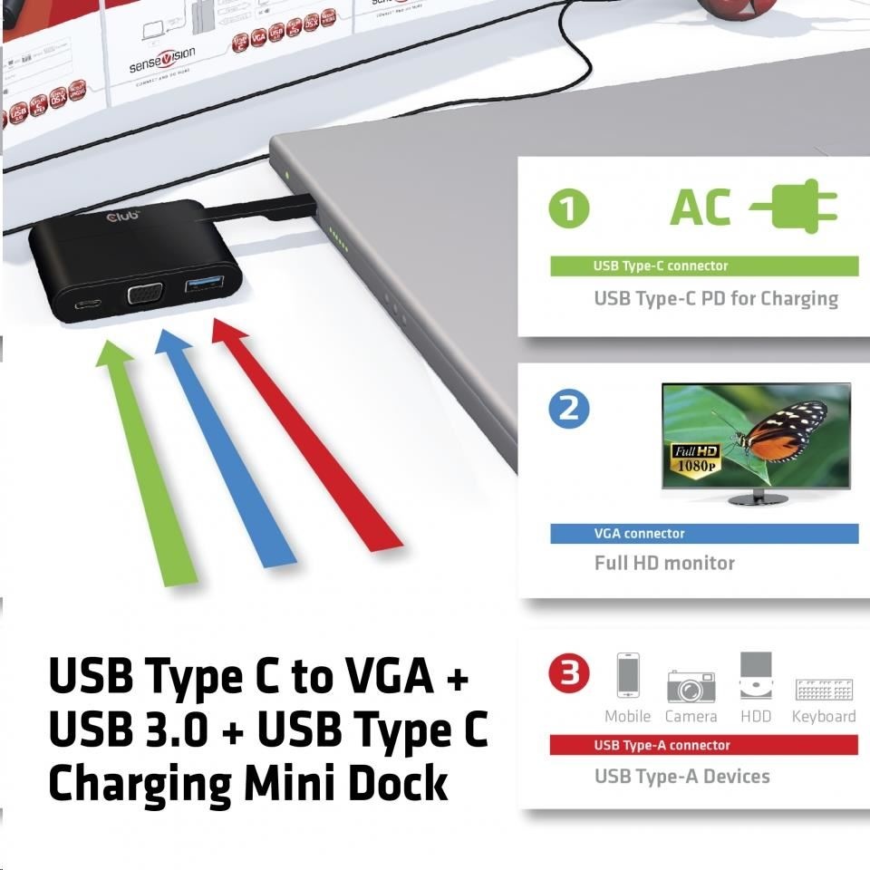 Club3D Dokovací stanice USB-C 3v1, 1xVGA, 1xUSB-C, 1xUSB, černá