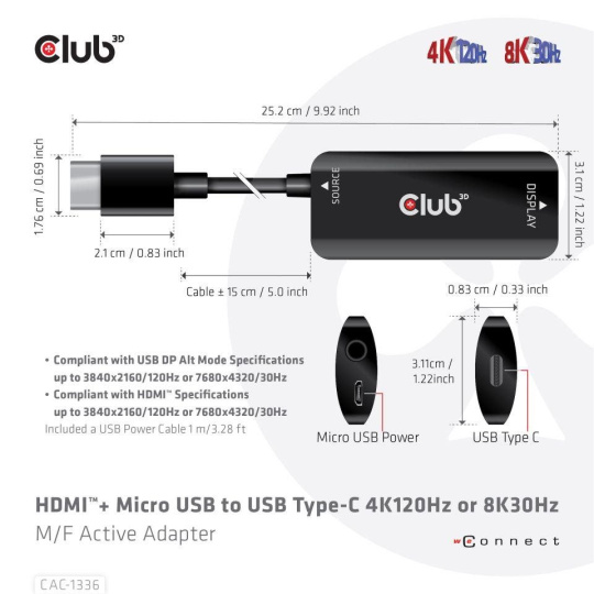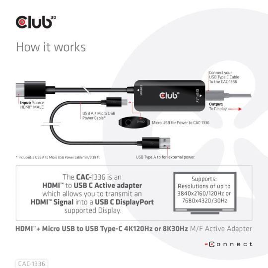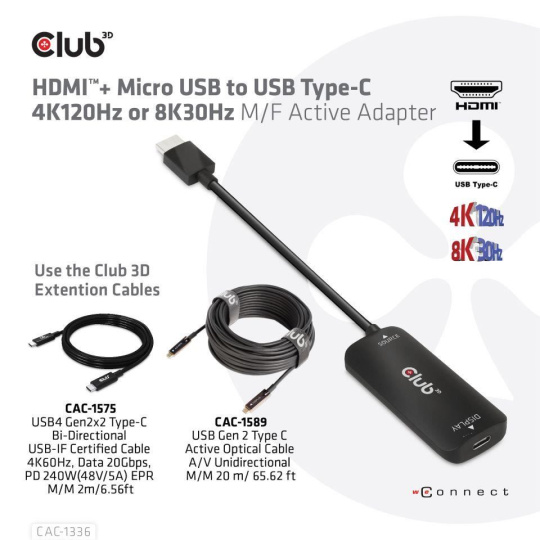 | In the box | - CAC-1336 HDMI™+ Micro USB to USB Type-C 4K120Hz or 8K30Hz M/F Active Adapter - USB Type-A to Micro USB M/M 1m / 3.28 ft cable for powering the adapter  |