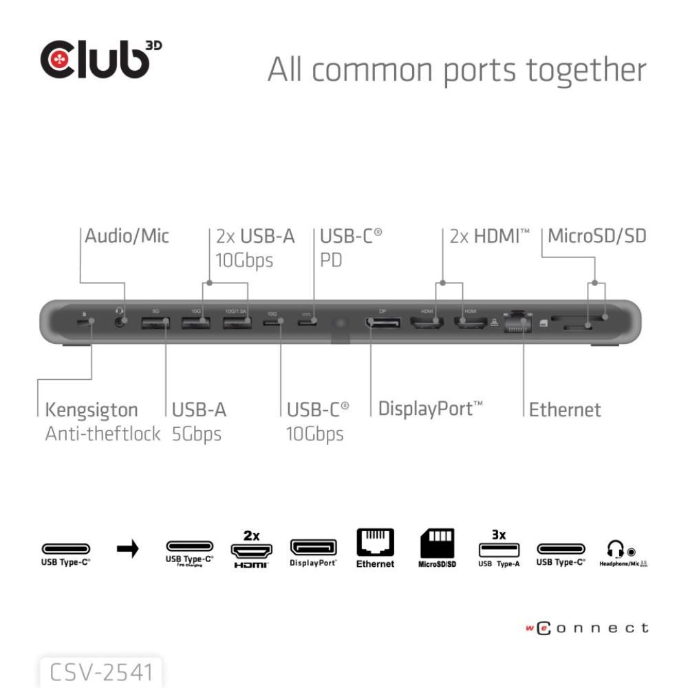 CSV-2541 je dokovací stanice USB Type-C 10Gb/s 12 v 1 s trojitým displejem, 2x HDMI, 1x DisplayPort, 1x datový port USB Type-C, 3x USB Type-A, RJ45, čtečka karet, 3,5mm audio port a nabíjecí port USB Type-C, která představuje ideální řešení pro rozšíření hostitelského počítače USB Type-C nebo Thunderbolt, zejména pro hostitele s jediným portem USB Type-C. Díky konstrukci se spodním držákem může být stabilním stojanem pro vaše notebooky. Dodává se se 100W nabíječkou a kabelem, který je součástí balení.
