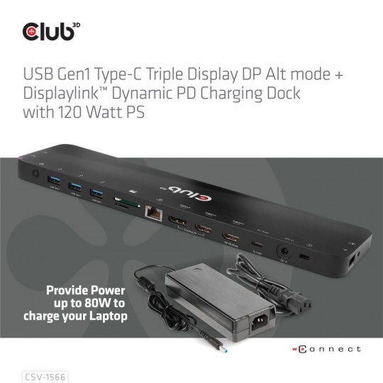 The Club 3D CSV-1566 USB Gen1 Type-C Triple Display DP™ Alt mode + Displaylink™/ USB mode™ Dynamic PD Charging Dock with 120 Watt PS, is an integrated solution combining Video, Data, Power, Ethernet and Audio. This Dock is perfectly suited for extending a Type-C port or USB-A port(via a Type-C to USB converter) to provide multiple audio,video, data and power ports, providing an ideal solution to satisfy users who require multiple ports. This dock has 3 video ports (2 HDMI™, one from DP™1.2 Alt mode, one from USB mode, 1 Displayport™ from USB mode) for video experience, 4 USB Gen1 Type-A and 1 USB Gen1 Type-C for data transmission, RJ45 for super high speed Ethernet, SD/TF card slots for connecting memory cards. Besides, it has a smart charging port, bringing fast charging performance for connected mobile device(Apple,samsung phones, pads,etc). A 120W power adapter is provided to supply power for the function of this dock and charge the host with max 80W (20V/4A). This dock is a bottom design with can be put underneath the host. It can work on DP™1.2 Alt mode supported USB Type-C and -A hosts.