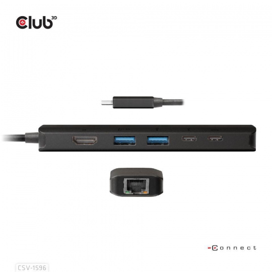 The Club 3D CSV-1596 is a USB Gen1 Type-C, 6-in-1 Hub with HDMI™8K30Hz, 2xUSB Type-A, RJ45 and 2xUSB Type-C, Data and PD charging 100 watt, providing an ideal solution for extending the port of Type-C/Thunderbolt host (PC/Laptop/Mobile phone,etc.), especially for those host with a single Type-C port. This hub adopts the latest DP1.4 Alt mode supported IC, enabling to output HDMI™ video with max. 8K30Hz and at the meanwhile transfer USB 3.1 data with max 5Gbps. The USB Type-A and Type-C data ports allow you to connect 4 USB devices simultaneously. 1 Gigabit Ethernet for super fast Ethernet. Besides, the Type-C female supports PD 3.0 PD Charging 100W (15W is dedicated to the functioning of this product, the rest power(max 85W) will be passed to charge for the host. This 6-in-1 Hub will work on all DP Alt mode supported Type-C hosts.