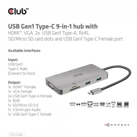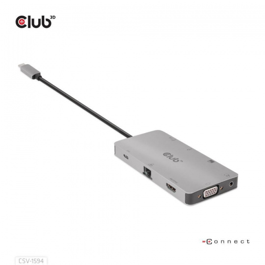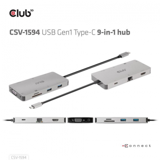The Club 3D CSV-1594 USB Gen1 Type-C 9-in-1 hub with HDMI™, VGA, 2x USB Gen1 Type-A, RJ45, SD/Micro SD card slots and USB Gen1 Type-C Female port, provides a very advanced, efficient solution to extend a single USB Gen1 Type-C port to be multiple ports. It integrates video, data and power ports that allows to connect 2 displays simultaneously for enjoying videos on a larger screen, connect multiple USB Gen1 devices for data transmission up to 5Gbps, connect a Gigabit Ethernet source for getting your PC connected to super high speed network, or connect to headset to enjoy fantastic music. It also provides PD charging for support up to max. 100W PD charging. This is for operating this device and charge the host simultaneously. It can work on all DP™1.2 Alt mode supported USB Gen1 Type-C hosts.
