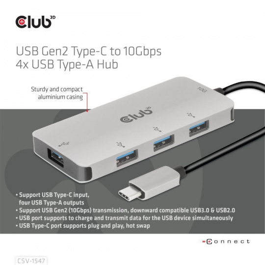 The Club 3D CSV-1547 is an USB Gen2 Type-C to four USB Type-A ports hub, which adds four common USB Type-A ports to your USB Type-C 10G enabled device for Data and Charging. It can work on any Type-C host ( PC, notebook, tablet, Mobile phone,etc). Works with all major Operating Systems.