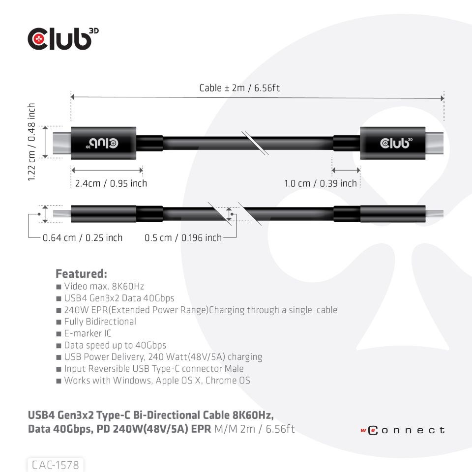 Club3D Kabel USB4 Gen3x2 Type-C Oboustranný kabel 8K60Hz, Data 40 Gbps, PD 240W(48V/5A) EPR M/M 2m