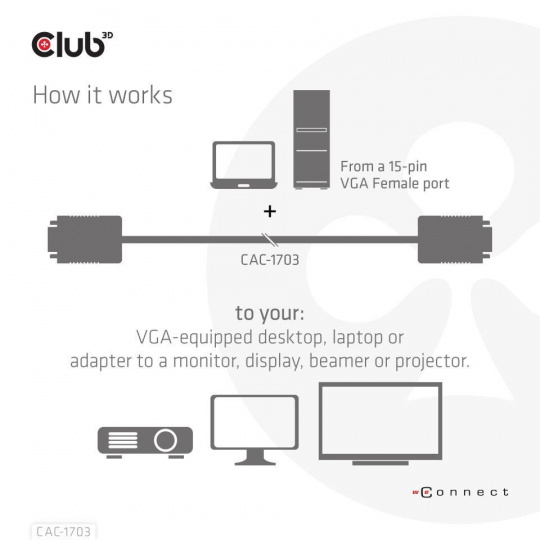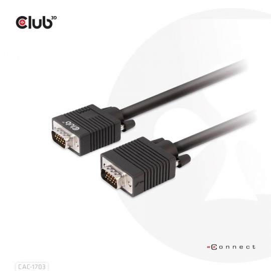 The Club 3D CAC-1703 VGA Cable Bidirectional M/M 3m/9.84ft 28AWG links any VGA-equipped desktop, laptop or adapter to a monitor, display, beamer or projector with a 15-pin VGA Female port. Ideal for at home or work, the cable creates a reliable connection for anything from gaming to video projection and supports up to Full HD 1080p (max. resolution of  1920 x 1080).