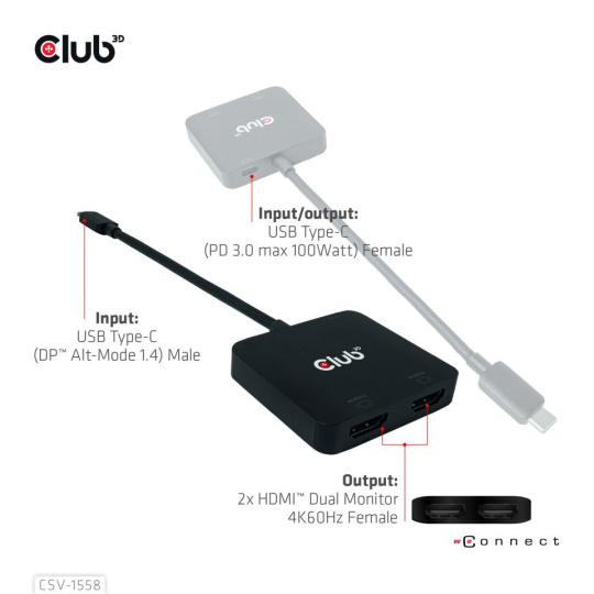 Club 3D CSV-1558 USB Type-C to Dual HDMI™ 4K60Hz + PD 100 watt Nabíjení v režimu DP1.4 Alt, umožňující rozšířit port USB Type-C hostitele na 2x HDMI™ displeje s ultra vysokým rozlišením max 4K60Hz pro každý displej současně. Díky podpoře funkce MST lze duální displeje zobrazovat současně s různým obsahem videa. Kromě toho podporuje nabíjení PD s maximálním výkonem 100 W. Může fungovat na všech zařízeních USB Type-C nebo Thunderbolt™ s podporou režimu DP™ Alt (včetně telefonů s připojením USB Type-C a podporou režimu DP™ Alt).