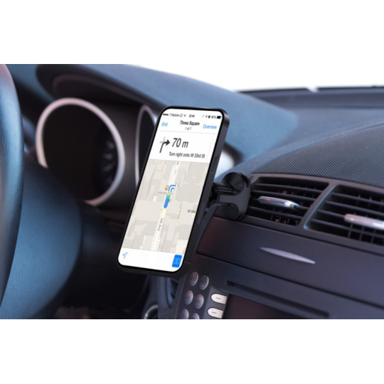 Pozice ve větrací mřížce splňuje bezpečnostní podmínky pro umístění mobilního telefonu v automobilu, kdy telefon nebrání řidiči ve výhledu. Instalace je velmi jednoduchá - stačí pouze zasunout aretační hák do větrací mřížky a utáhnout pomocí aretačního kolečka. Pak už stačí telefon jen přiblížit jeho zadní stranou k držáku a vlivem magnetické síly se sám aretuje na držáku. Držák nabízí totožnou stabilitu jak ve vertikální tak i v horizontální poloze.