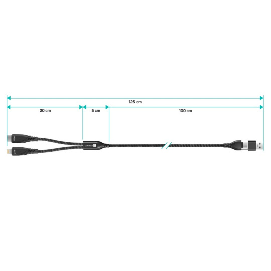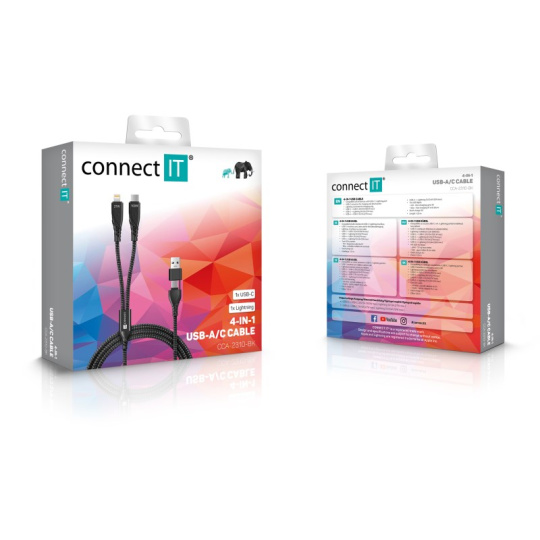 Univerzální nabíjecí kabel 4v1 pro nabíjení zařízení s konektory 1x USB-C a 1x Lightning se vstupním konektrom USB-C a redukcí na USB-A. Umožňuje nabíjení až dvou zařízení současně s podporou rychlého nabíjení pomocí max. proudového toku 5 A. Speciální manžetová nadstavba konektorů zaručuje lepší přístupnost k nabíjecím zdířkám mobilních telefonů v pouzdrech.
