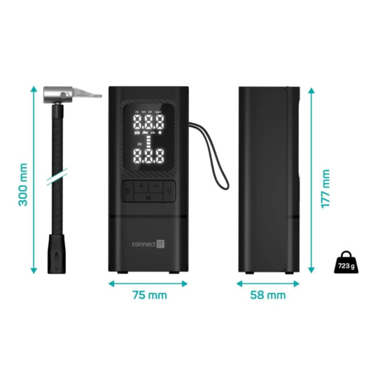 Kompresor disponuje velkým LED displejem, který zobrazuje stav nabití baterie, výběr přednastaveného režimu, výši tlaku a aktuální hodnotu tlaku. K dispozici je pět přednastavených režimů s výchozím rozsahem tlaku vzduchu pro jednotlivé použití (auto/motorka/kolo/míč/manuál). V manuálním režimu si můžete zvolit hodnotu, kterou si kompresor bude pamatovat pro příští použití. Díky vestavěné Li-Ion baterii s kapacitou 6 000 mAh, budete mít jistotu bezproblémového použití kdykoliv a kdekoliv. V případě nouze můžete kompresor využít i jako powerbanku a díky LED světlu si můžete posvítit při zhoršených světelných podmínkách. Kompresor je vyroben z kombinace polykarbonátu a ABS, který je extrémně pevný a tvrdý, odolný vůči vysokým teplotám (115 °C) a nárazu.