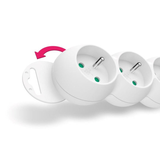 Prodlužovací kabelový přívod na 230V je vybaven hlavním síťovým vypínačem, který při vypnutí zcela odpojí od přívodu elektrické energie všechny zapojené spotřebiče najednou. Extra výbavou je dětská ochrana všech zásuvek – zásuvky jsou přístupné pouze v případě zasunutí obou vidlic najednou, nelze tedy zasunout jednotlivě např. pouze šroubovák nebo pletací jehlici. Díky pootočení zásuvek o 45° je možné používat i objemnější napájecí adaptéry nebo úhlové koncovky. Výsuvné očko v horní části zásuvkového modulu umožňuje zavěšení nebo pevnou instalaci na stěnu (s výhodou využijete např. v dílnách a garážích). Výrobek byl testován a certifikován v evropském testovacím centru a splňuje nejpřísnější bezpečnostní požadavky a nejnovější normy, takže umožňuje zapojení spotřebičů o celkovém příkonu až 2300 W.