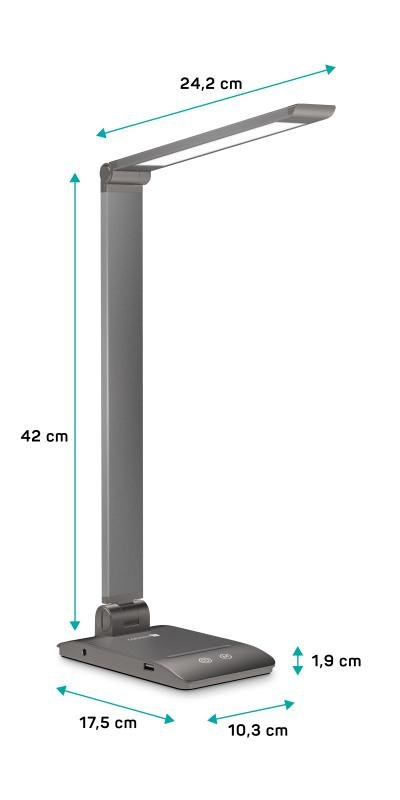 Díky sklopnému rameni a krku nastavíte dokonalý úhel pro jakoukoliv práci. Lampička disponuje USB-A výstupem s výkonem 5 W a dvěma praktickými dotykovými spínači, které umožňují zapnout/vypnout lampu, nastavit 3 úrovně jasu světla nebo nastavit barevnou teplotu světla ve 3 různých úrovních (3000/4000/6500 K).