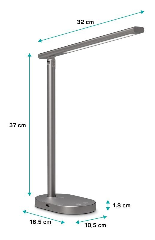 Díky sklopnému rameni nastavíte dokonalý úhel pro jakoukoliv práci. Lampička disponuje USB-A výstupem s výkonem 5 W a dvěma praktickými dotykovými spínači, které umožňují zapnout/vypnout lampu, nastavit 3 úrovně jasu světla nebo nastavit barevnou teplotu světla ve 3 různých úrovních (3000/4000/6500 K).