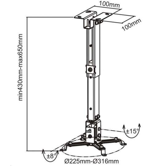 Univerzální držák k montáži projektoru na strop - barva: šedivá - naklápění: ±30° - snadná a rychlá montáž - včetně šroubů a hmoždinek - vzdálenost projektoru od stropu nastavitelná: 43-65 cm - nosnost: 20 kg.