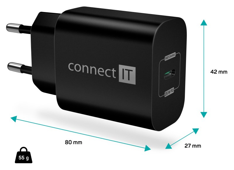 Cestovní USB nabíječka CONNECT IT "Voyager2" určená pro napájení i nabíjení mobilních telefonů, tabletů, power bank, akčních kamer, elektronických čteček knih, MP3 a MP4 přehrávačů, herních konzolí a mnoha dalších přenosných zařízení doma, v kanceláři i na cestách. Technologie Power Delivery (PD) umožňuje rychlonabíjení o výkonu 25 W.
