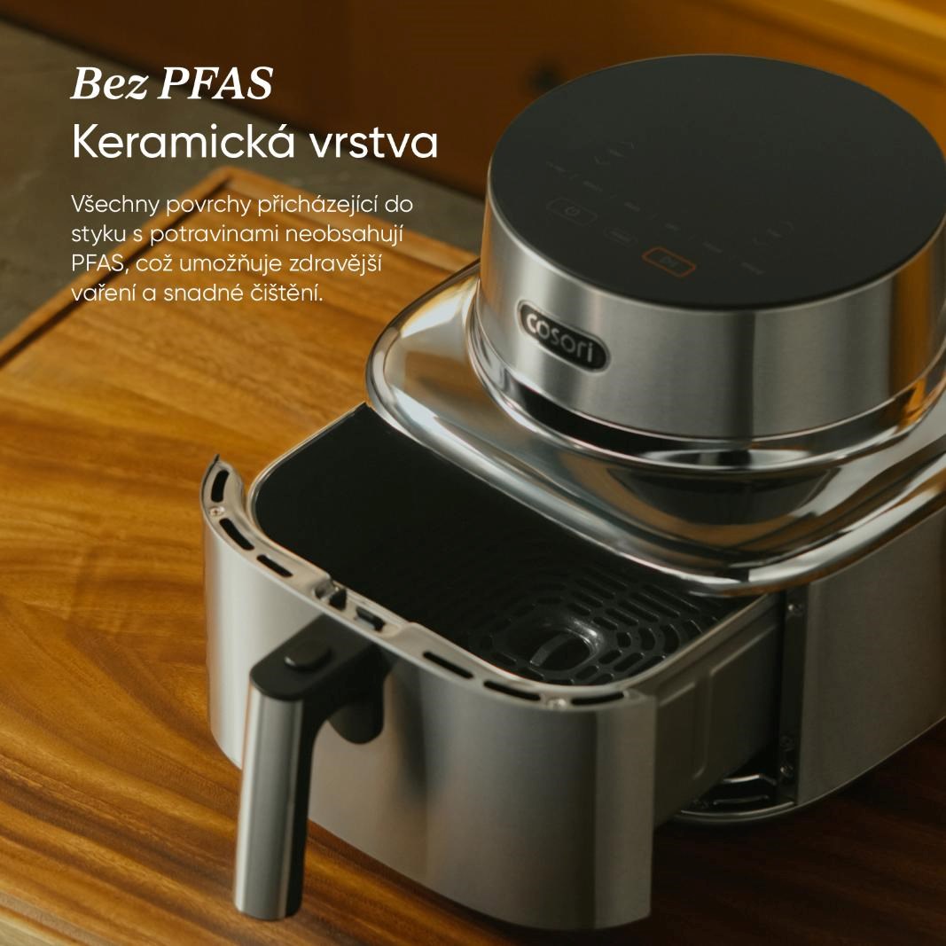 COSORI Iconic byl navržen jako přirozená součást moderního interiéru, ne jako obyčejný spotřebič. Nerezová ocel a tvrzené sklo vytvářejí čistý, klidný vzhled, který krásně zapadne do minimalistických kuchyní. Je to objekt, který potěší oko pokaždé, když kolem něj projdete.