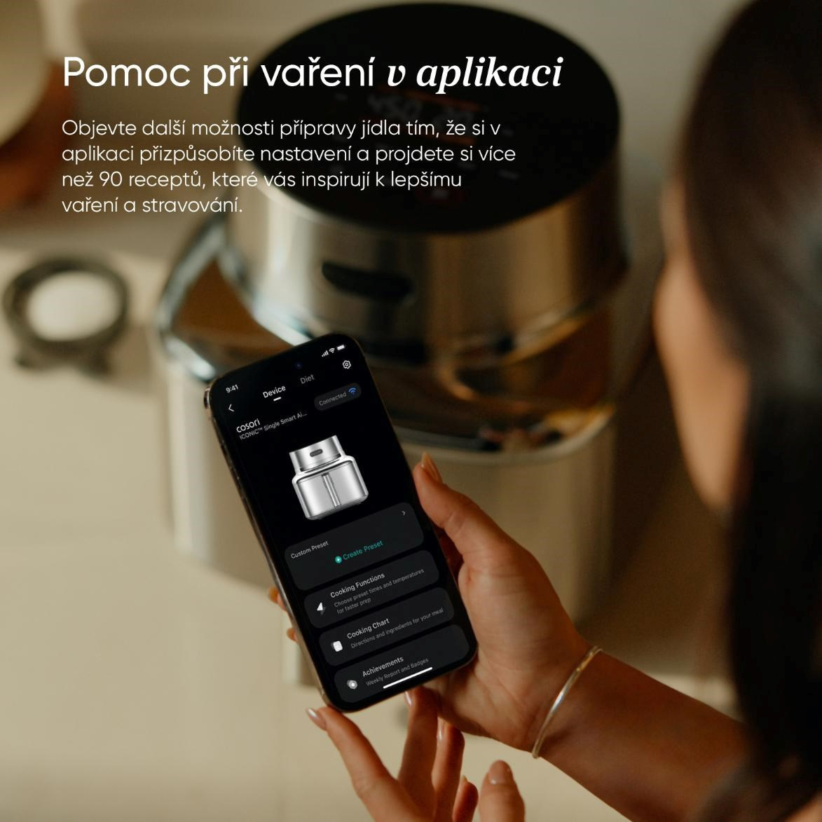 - Chytré ovládání přes aplikaci přináší recepty, plánování a plnou kontrolu přímo do vašeho telefonu