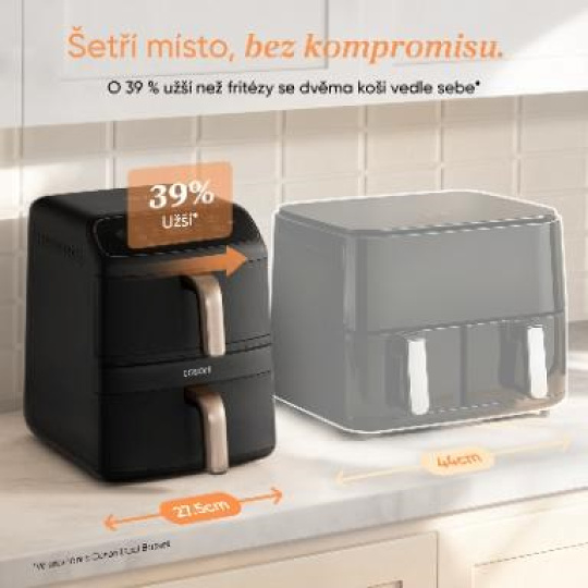 Díky vertikálnímu designu zabere Cosori Turbo Tower™ Compact až o 39 % méně místa než klasické dvoukošové fritézy. I při šířce pouhých 27,5 cm nabízí plnohodnotnou 8,6l kapacitu. Na lince tak získáš víc prostoru, aniž bys musel obětovat výkon nebo objem. Ideální řešení do moderních i menších kuchyní.