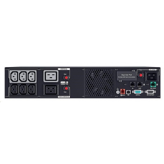 | Dodávka obsahuje | UPS, Kolejnice a Úchytypro montáž do Racku, sériový, USB. EPO kabel, uživatelská, příručka, kabely (2) IEC C13-C14 a (1) IEC C19-C20 |