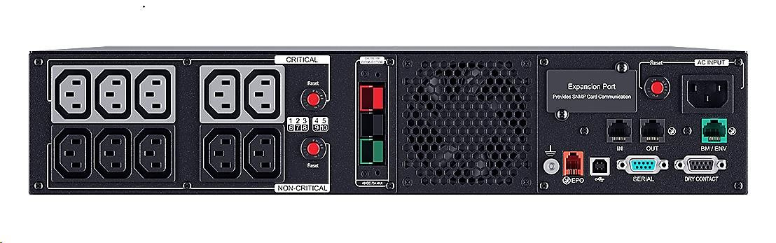 | Dodávka obsahuje | UPS, Kolejnice a Úchytypro montáž do Racku, sériový, USB, EPO kabel, uživatelská příručka, kabely (2) IEC C13-C14 |