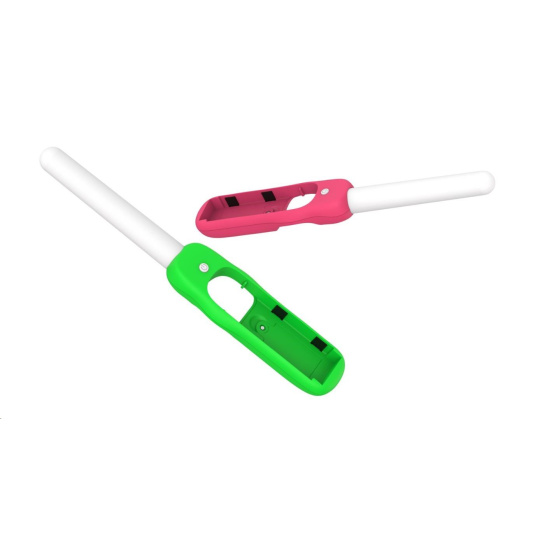 Dance ‘N’ Play Kit obsahuje 2x svíticí tyčinky LED citlivé na zvuk, s růžovým a zeleným úchytem a zápěstními řemínky. Svíticí tyčinky LED citlivé na zvuk s vícebarevným efektem duhového podsvícení budou fungovat, pulzovat, zářit a tančit podle jakéhokoliv zvuku. Ať už půjde o hudbu, nebo zvuky ze hry, Dance ‘N’ Play Kit prozáří váš pokoj.