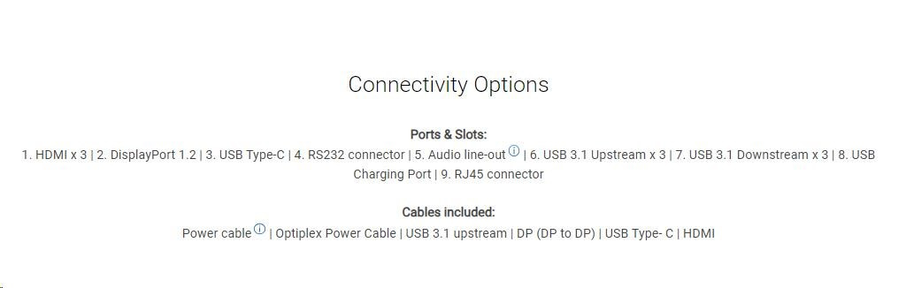 | Power cable | Optiplex Power Cable | USB 3.1 upstream | DP (DP to DP) | USB Type- C | HDMI |