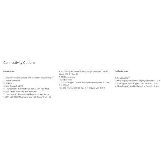 Použití:Profesionální; Rozlišení displeje:nespecifikováno; Úhlopříčka displeje ("):32; Výbava:VESA montáž, Pivot, Nastavitelná výška, Webkamera; HDMI počet:1; HDMI verze:2.0; DP počet:1; DP verze:2.0; USB počet:5; Thunderbolt počet:2; Thunderbolt verze:4; Doba odezvy (ms):8; Formát obrazovky:16:9; Typ panelu:IPS; Jas (cd/m2):450; Kontrast:1:2000.