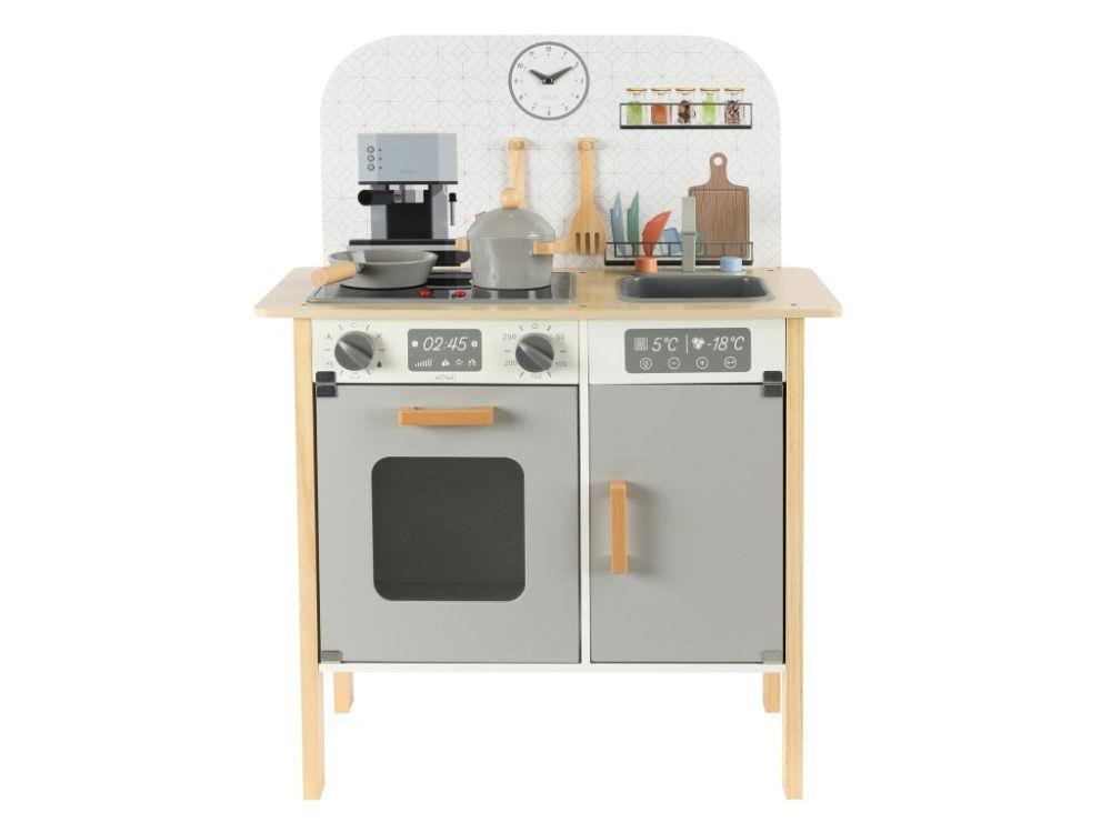 Menší dětská kuchyňka v neutrálních barvách, doplněná o bohaté příslušenství a textilní kuchařský set ZDARMA, promění holčičky i chlapce v opravdové kuchaře. Kuchyňka ve skandinávskému stylu, se spotřebiči a parádními doplňky, je vhodná do každé místnosti. Menší dřevěná kuchyňka je edukativní hračkou, která umožní dětem vyzkoušet si vaření, pečení a další činnosti bezpečným dětským způsobem. Při hře v kuchyňce děti zdokonalí své dovednosti a ještě si užijí spoustu zábavy..