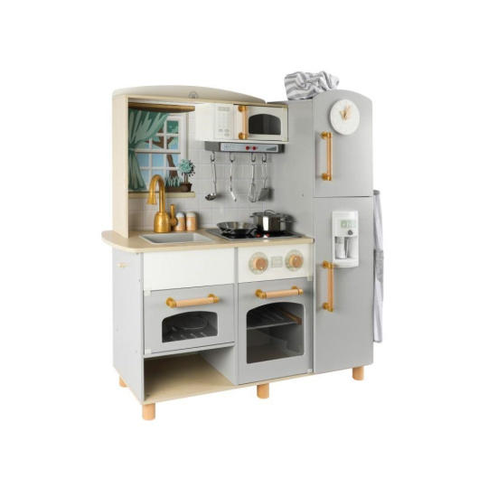 Stylová dětská kuchyňka doplněná o bohaté příslušenství a textilní kuchařský set ZDARMA, okouzlí malé kuchařky i kuchaře. Dřevěná kuchyňka ve skandinávskému stylu, se základními spotřebiči, parádními doplňky a zvukovými efekty, je vhodná do každé místnosti. Díky této krásné edukativní hračce si děti vyzkouší vaření, pečení, chystání pokrmů, umývání nádobí a další činnosti bezpečným dětským způsobem. Při hře v dřevěné kuchyňce děti zdokonalí své dovednosti a ještě si užijí spoustu zábavy..