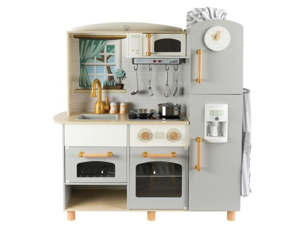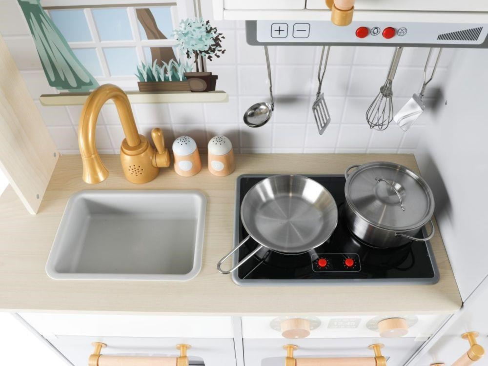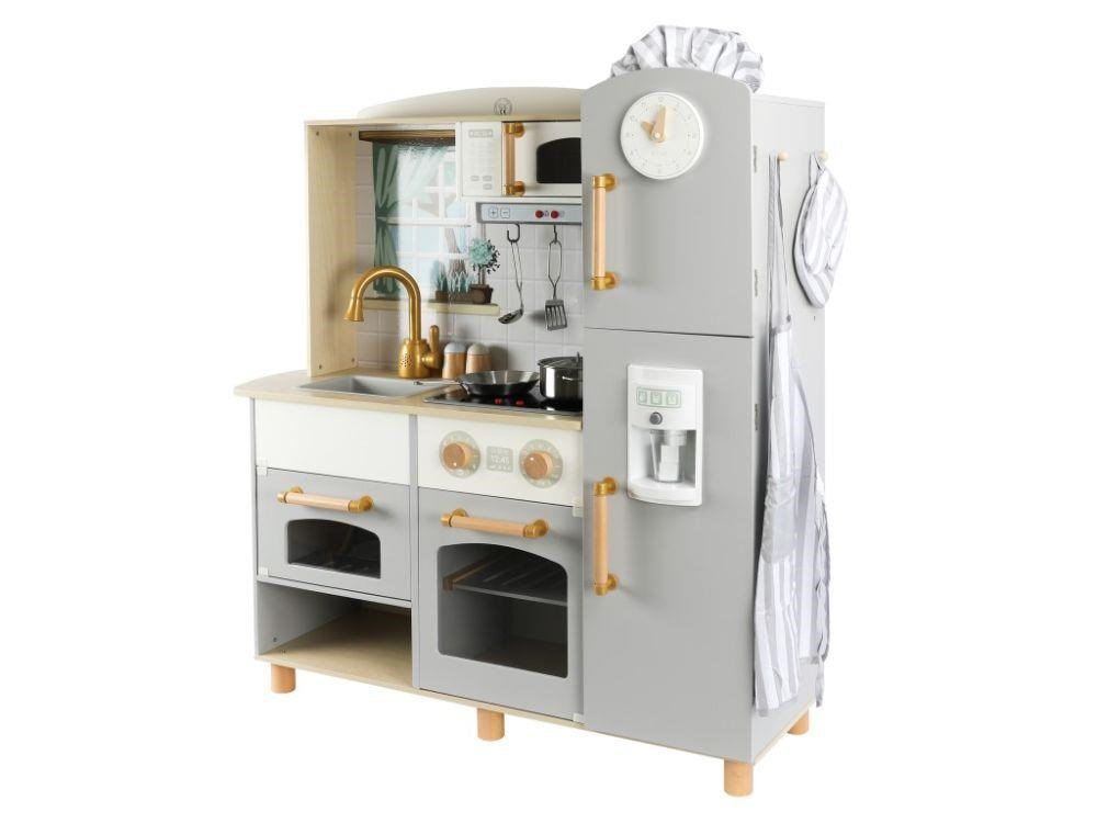 Stylová dětská kuchyňka doplněná o bohaté příslušenství a textilní kuchařský set ZDARMA, okouzlí malé kuchařky i kuchaře. Dřevěná kuchyňka ve skandinávskému stylu, se základními spotřebiči, parádními doplňky a zvukovými efekty, je vhodná do každé místnosti. Díky této krásné edukativní hračce si děti vyzkouší vaření, pečení, chystání pokrmů, umývání nádobí a další činnosti bezpečným dětským způsobem. Při hře v dřevěné kuchyňce děti zdokonalí své dovednosti a ještě si užijí spoustu zábavy..