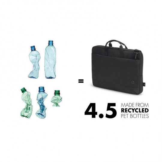 Characteristics • Made of 4.5 recycled PET bottles • Padded notebook compartment with high density foam (HDF) • Slip pocket for tablets up to 10.9" • Front pocket with storage space for mobile accessories • Document compartment on the back • Comfortable padded handle • Removable, adjustable shoulder strap • Water-repellent material