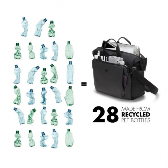 Characteristics • Made of 28 recycled PET bottles • Padded notebook compartment with fitall system • Slip pocket for tablets up to 12.9" • Spacious main section with compartments for documents and accessories • Front pocket with storage space for mobile accessories • Open expandable compartment for active gear • Mesh pocket for water bottle or umbrella inside the bag • Document compartment on the back