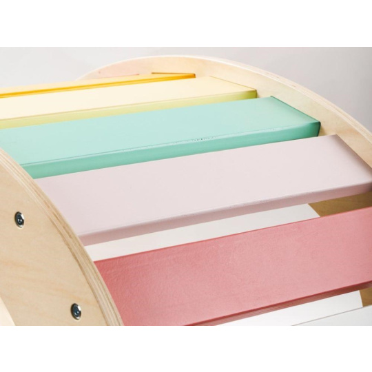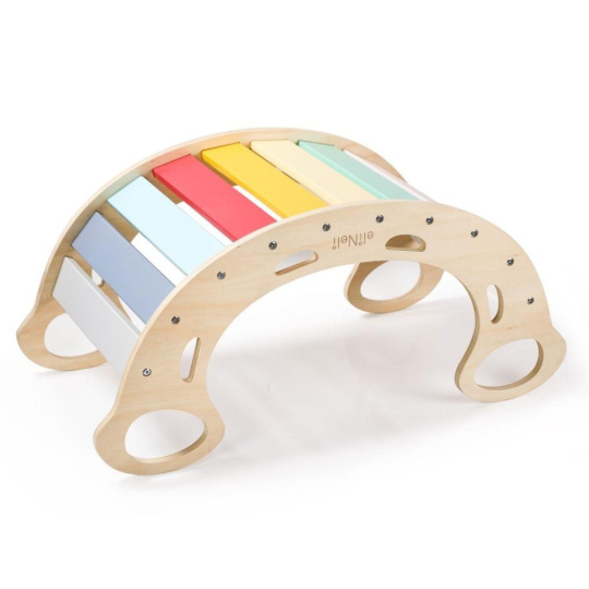 Vylepšený set multifunkční dřevěné houpačky 5v1 s prknem 2v1 hravě vytvoří malé dětské hřiště v dětském pokoji. Montessori houpačku s deskami ve svěžích fresh barvách děti využijí samostatně, jako zábavnou hračku při spoustě her (skrýš, most, prodejní pult, obchod) i pohybových aktivitách (houpačka, prolézačka, stolička) nebo v setu s lezeckou stěnou a skluzavkou v jednom. Barevný set přirozeným způsobem rozvíjí motorické dovednosti a vhodný je pro děti již od 1 roku..