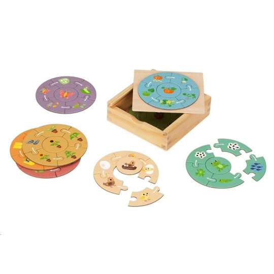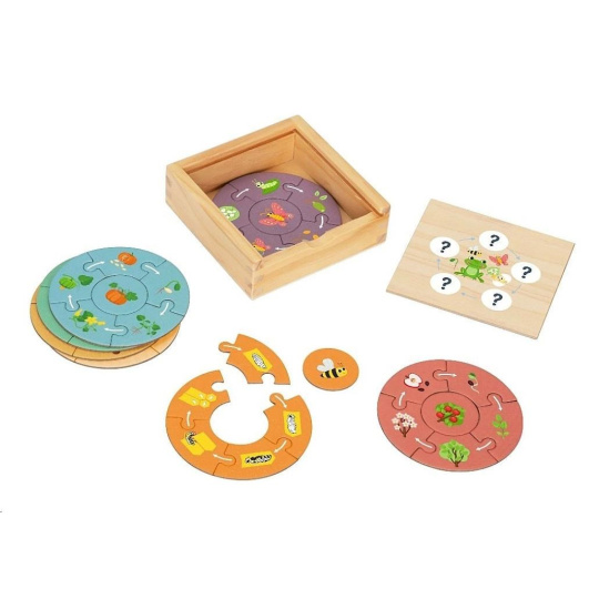 Dřevěné puzzle s originálním motivem cyklu života rostlin i zvířátek bude úžasnou hračkou pro děti od 3 let. Osm kruhových puzzle skládaček se šesti díly děti seznámí s podobou rostlin a zvířátek, od samého počátku až po jejich zralost a dospělost. Vše, co se děti při skládání naučí, spolu můžete později pozorovat venku, například při procházce, na zahradě nebo na prázdninách u babičky. Děti pochopí princip stárnutí a koloběh života nejen včelky, žabky, motýlka, ptáčka, slunečnice, jabloně, dýně a rajčete, ale začnou si všímat změn rostlin a zvířat ve svém okolí.