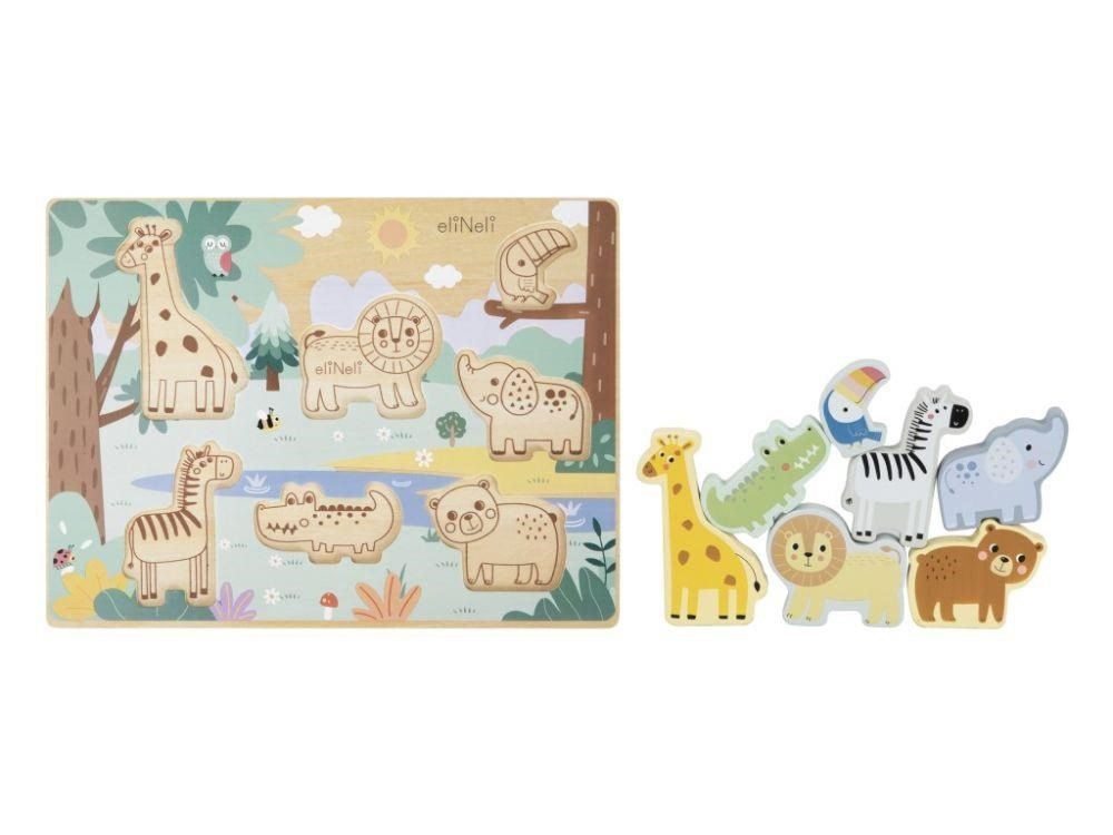 Vkládací puzzle pro děti s oblíbenými zvířátky - žirafou, zebrou, lvem, krokodýlem, medvědem, slonem a tukanem, zavede děti do ZOO. S dřevěnou hrací deskou a dřevěnými puzzle dílky v podobě zvířátek děti potrénují motorické dovednosti, koordinaci očí, logické myšlení, naučí se trpělivosti a soustředit se..