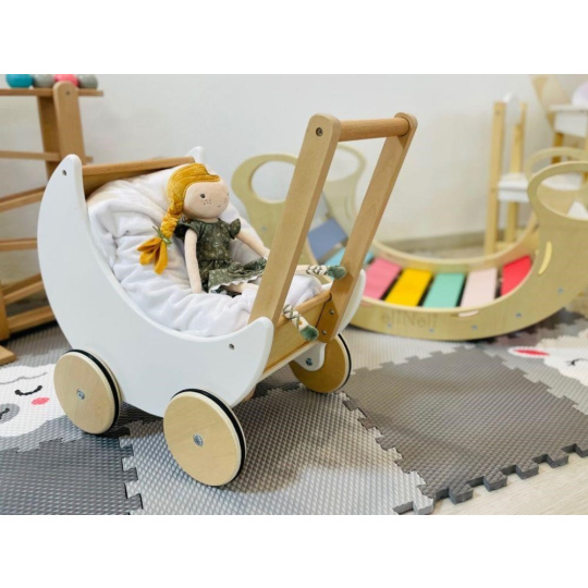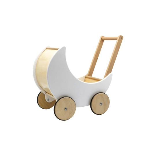 Designový kočárek ve tvaru měsíčku, vyrobený z přírodního dřeva, je jako stvořený pro krátké i dlouhé procházky, uspávání oblíbených panenek nebo plyšáků. Dřevěný kočárek dobře padne do dětské ručky, snadno se řídí a ovládá. Kočárek pro panenky zaparkovaný v dětském království vaší princezny je současně i krásnou dekorací..