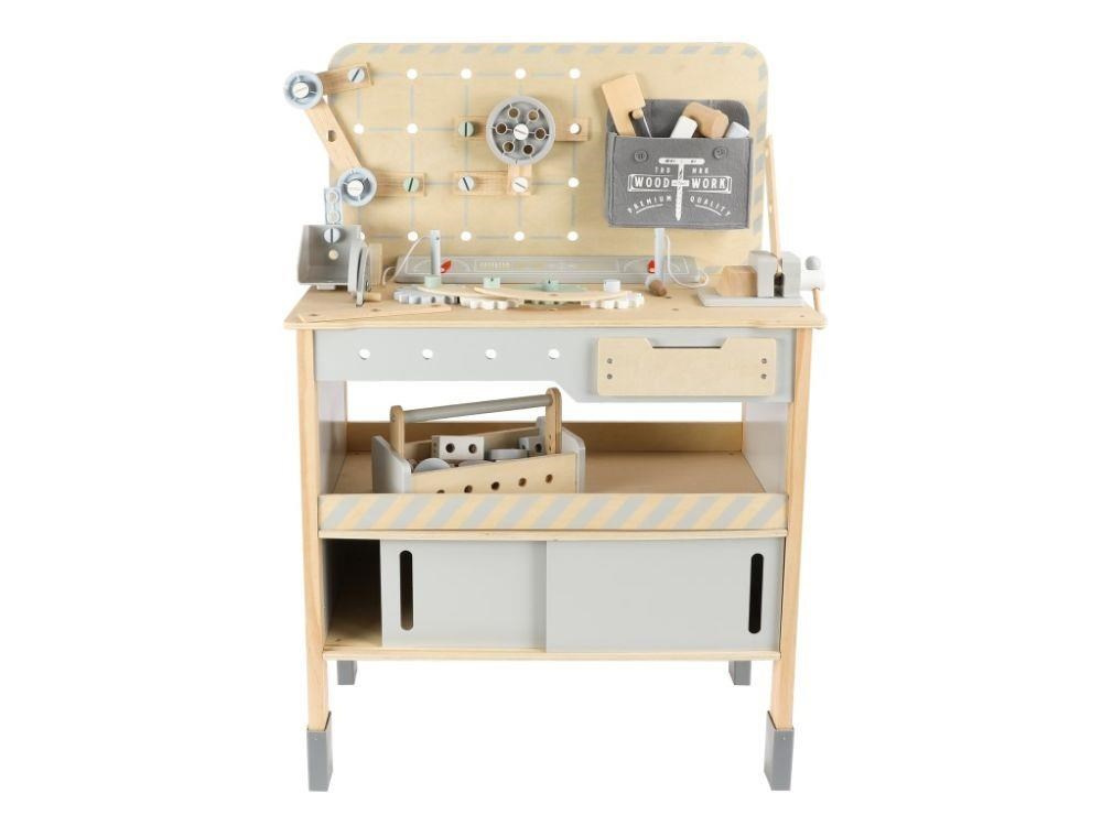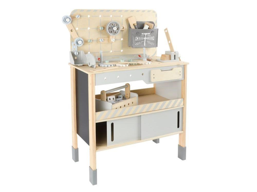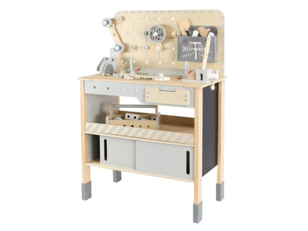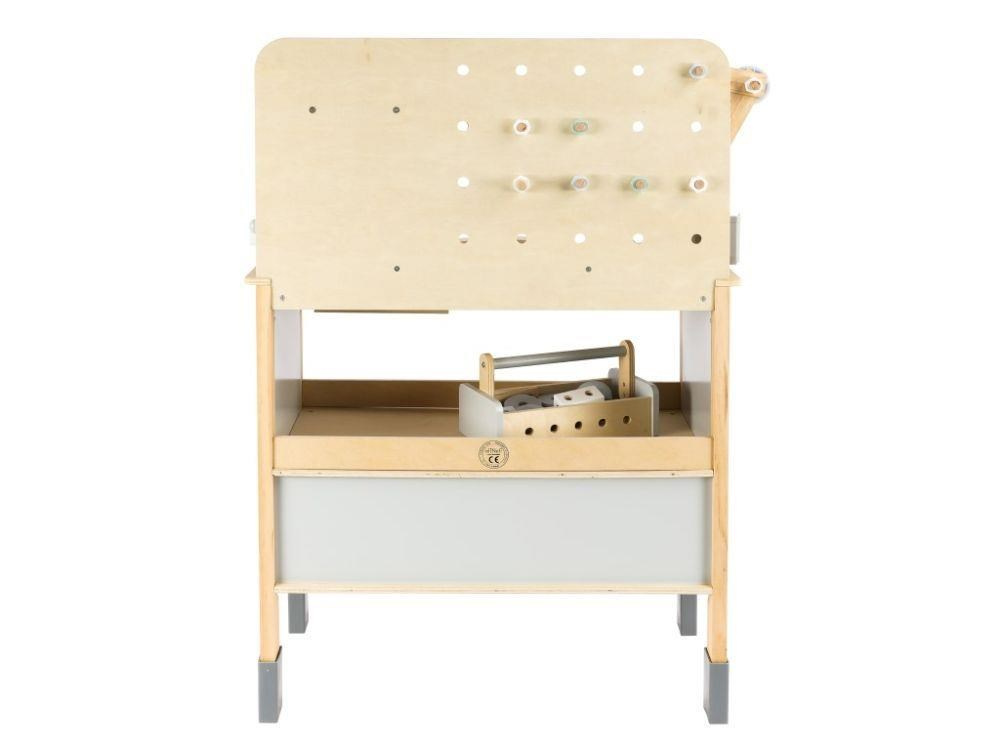 Dětský dřevěný ponk XXL se spoustou příslušenství, parádním jeřábem a opaskem na nářadí ZDARMA nadchne každého malého kutila. Dětský ponk v kombinaci šedé barvy s barvou přírodního dřeva, s jeřábem, nářadím, šrouby, destičkami a hlavně se spoustou vychytávek potrénuje jemnou motoriku, manuální zručnost, koordinaci očí a rukou, rozvíjí kreativitu, učí děti soustředit se a trpělivosti..