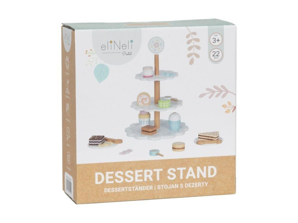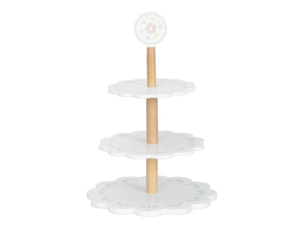 Dřevěný patrový stojan s lahodně vypadajícími dřevěnými zákusky a cukrovinkami je jako stvořený pro oslavy a čajové dýchánky uspořádané pro rodiče, kamarády i oblíbené plyšáky. Dřevěný stojan s bohatým příslušenstvím je skvělým doplňkem do dětské kuchyňky i obchůdku. Děti si mohou zahrát na cukráře i prodavače, rozvíjet svou fantazii a zdokonalovat dovednosti..