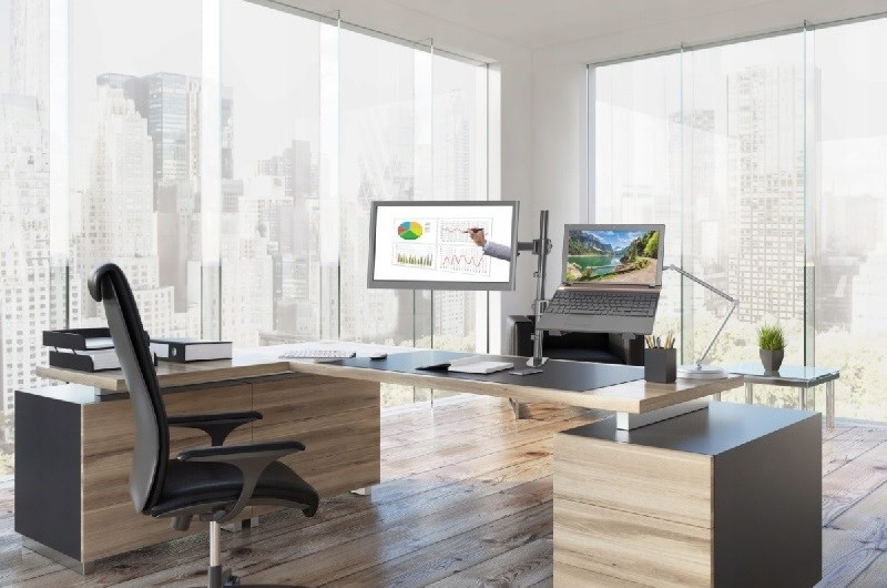 Držák notebooku nebo laptopu a monitoru Fiber Mounts FM23 Kvalitní sestava stolní držák na monitor 15-27" a držák na notebook laptop 13-17", polohovatelný, stabilní a pevný Vybavte si kancelář skvělým pomocníkem, který Vám uspoří spoustu místa a zlepší ergonomii při práci. Sestava Fiber Mounts FM23 obsahuje držák na monitory 15-27" a držák na notebooky nebo laptopy s úhlopříčkou 13-17". Držák monitoru podporuje VESA 75x75 a 100x100, lze ho otáčet do stran, naklápět, rotovat a výškově polohovat. Držák notebooku lze otáčet do stran a výškově polohovat. Barevné provedení černé, celková nosnost 20kg, celokovová konstrukce. Stolní držák na monitor a notebook do vaší kanceláře - Fiber Mounts FM23 Technické údaje: nosnost 20kg na monitory 15-27" na notebooky 13-17" VESA standard 75x75 a 100x100 otáčení do stran +/- 135° naklápění monitoru +/- 90° uchycení na stolové desky s tloušťkou 10-100mm barva černá záruka 3 roky Stolní držák na monitor a notebook do vaší kanceláře - Fiber Mounts FM23 Držák na monitory podporuje standardy VESA: VESA 75x75 VESA 100x100.