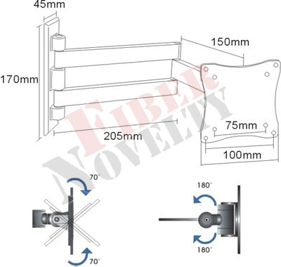 Držák na televize a monitory Fiber Novelty FN101 Kvalitní otočný držák na monitor nebo menší televizi do 32", možnost velkého náklonu, nastavitelná vzdálenost od zdi Kvalitní televizní držák na monitory a menší televize. U držáku je velmi snadná montáž, protože je dodáván ve smontovaném stavu a nastavení obrazovky do požadované polohy je otázkou vteřin. Tento držák na monitory má výborné řešení sklonu, nevznikají žádné vůle a náklon je možný nahoru i dole v úctyhodných až 70 stupních. Držák FN101 unese zátěž až 15kg a doporučujeme ho pro obrazovky s úhlopříčkou do 32". Nástěnná konzola pro zavěšení lcd led obrazovek, otáčení do stran, náklon, změna vzdálenosti od zdi - Fiber Novelty FN101 Technické údaje: max. zatížení 15kg podporuje VESA standard 75x75 a 100x100 doporučujeme na monitory nebo menší televizory s úhlopříčkou 15" až 32" možnost náklonu až +/- 70° otočný do stran +/- 90° minimální vzdálenost obrazovky od zdi 50mm maximální vzdálenost obrazovky od zdi 370mm kvalitní konstrukce z hliníku snadné nastavení obrazovky do požadované polohy instalační materiál součástí balení záruka 5 let Držák Fiber Novelty FN101 podporuje VESA standardy: VESA 75x75 VESA 100x100 Držáky Fiber Novelty FN101 je vhodný na všechny typy televizorů a monitorů, které podporují VESA standard 75x75 nebo 100x100 a jejichž hmotnost je maximálně 15kg. Na velikosti úhlopříčky nezáleží, je možné zavěsit jak větší, tak i menší obrazovky..