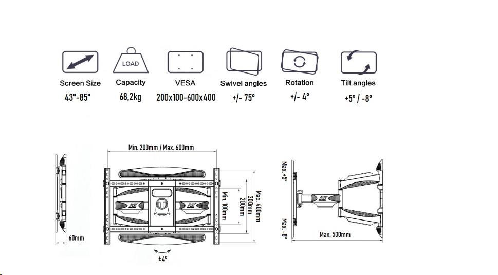 Držák na Tv NB P65 Profesionální držák na zavěšení Tv 43" - 85" na zeď, umožňuje otáčení do stran až +75° / -75°, naklápění +5° / -8°, nastavení vzdálenosti od zdi 60 - 500 mm, podporuje VESA standardy 200x100 až 600x400, korekce roviny +4° / -4°, systém pro skryté vedení kabeláže, nosnost 68,2 kg Potřebujete zavěsit LCD nebo LED televizor na zeď a otáčet s ním do stran, případně naklonit nahoru nebo dolů? Požadujete pouze nejvyšší kvalitu, bezpečnost a krásný design? V tom případě Vám doporučujeme držák NB P65: Profesionální špičkový držák na televize NB P65 NB P65 je vhodný pro zavěšení všech typů televizorů s hmotností do 68 kg a podporou VESA standardu 200x100 až 600x400, obecně na televizory s úhlopříčkou 43" - 85". Po zavěšení snadno televizor nastavíte do požadované polohy - otáčení do stran, náklon, vzdálenost od zdi, korekce roviny. Držák podporuje skryté vedení kabeláže. Dodáván je včetně veškerého montážního materiálu a malé vodováhy. Konstrukce držáku Tv NB P65 je na vynikající úrovni jak kvalitou tak provedením. Vhodný je i pro každodenní manipulaci s obrazovkou. Televizní držák otočný do stran a sklopný NB P65 Technické údaje: maximální zatížení 68,2 kg podporuje VESA standardy 200x100 až 600x400 doporučujeme na Tv s úhlopříčkami 43" až 85" otáčení do stran až +75° / -75° náklon +5° / -8° korekce roviny +4° / -4° minimální vzdálenost Tv od zdi 60 mm maximální vzdálenost Tv od zdi 500 mm systém pro skryté vedení kabeláže kvalitní ocelová konstrukce montážní materiál součástí balení zajištění Tv proti vysazení záruka 5 let.