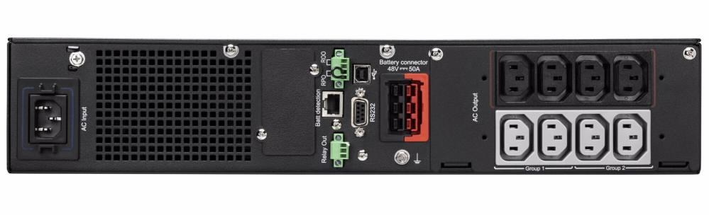 | Komunikace | USB port (kompatibilní s HID) Sériový port (RS232) Mini svorkovnice pro dálkové zapnutí / vypnutí (ROO) a vzdálené vypnutí (RPO) Mini svorkovnice pro výstupní relé Bezpotenciálové kontakty (3 výstupy, 1 vstup, optočlen, DB9) |