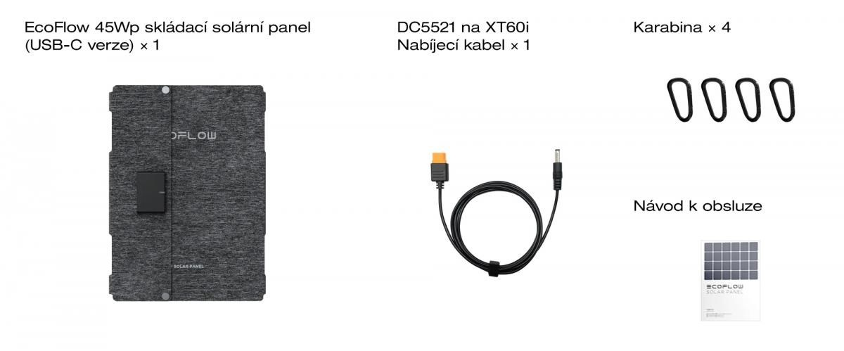 Skládací solární panel EcoFlow 45 Wp je ideálním panelem na cesty. Může dobíjet veškerá USB-C mobilní zařízení, například mobily, laptopy, čelovky apod. Díky druhému výstupu DC5521 jej můžete připojit i k solárním regulátorům bateriových stanic EcoFlow řady RIVER a DELTA.